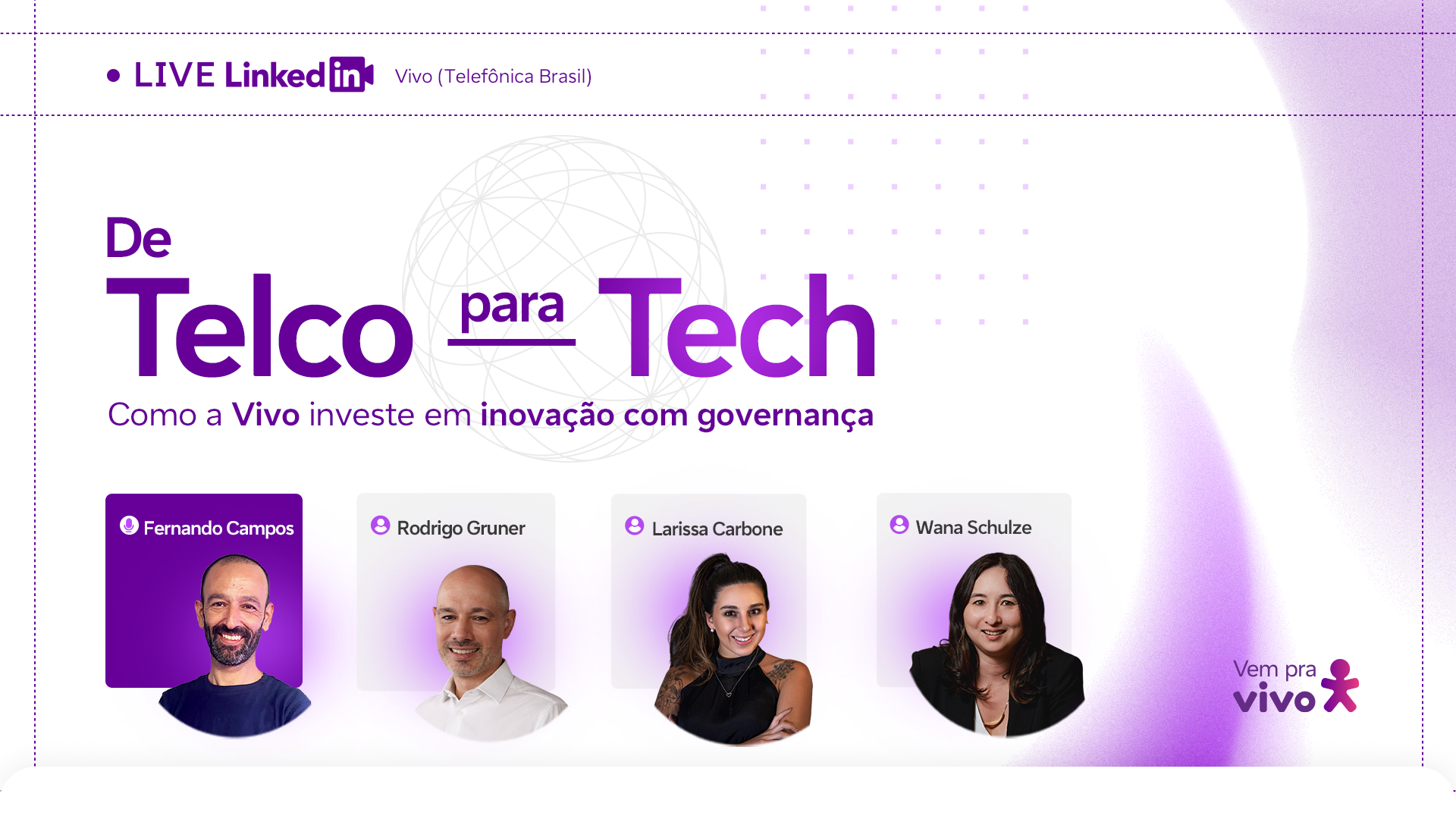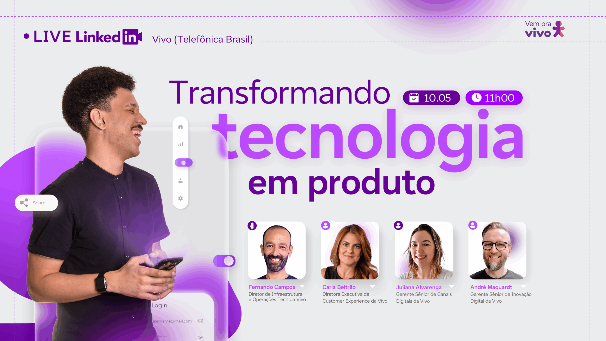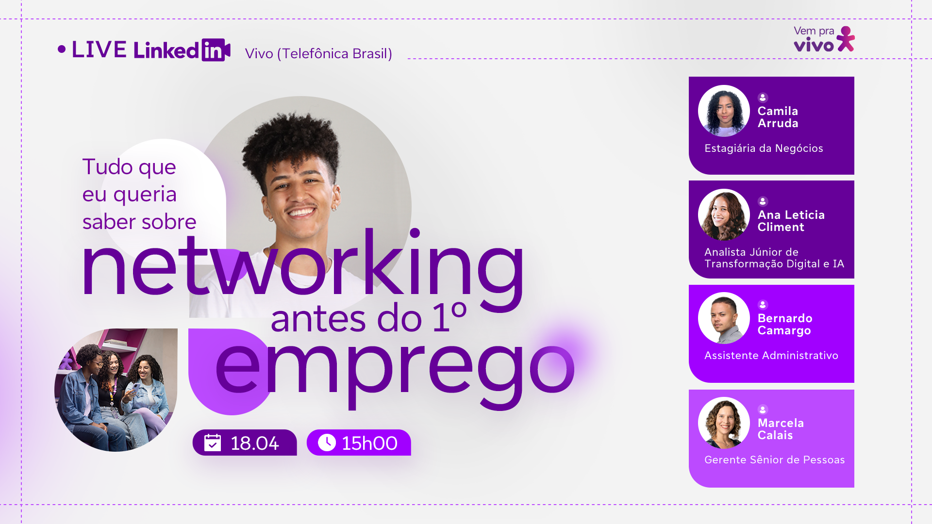 Todo mês, uma live diferente com a participação de especialistas debatendo sobre os assuntos em alta em carreira e tecnologia. As lives são gratuitas e transmitidas diretamente no LinkedIn da Vivo.